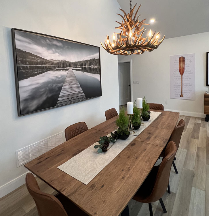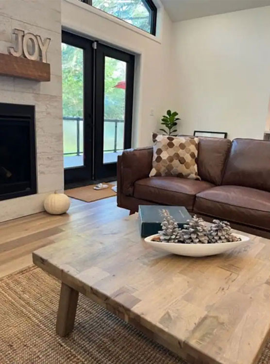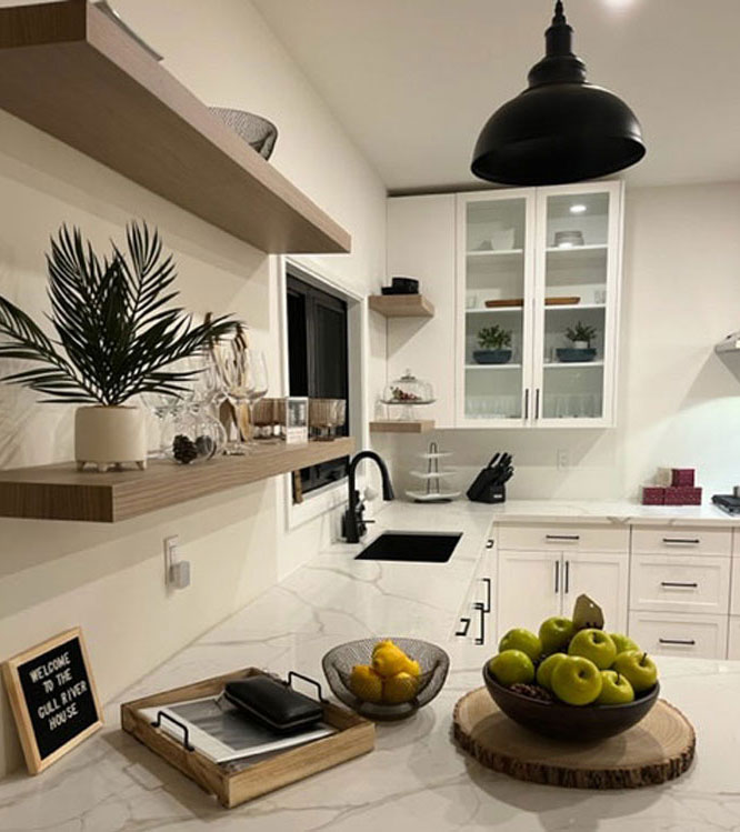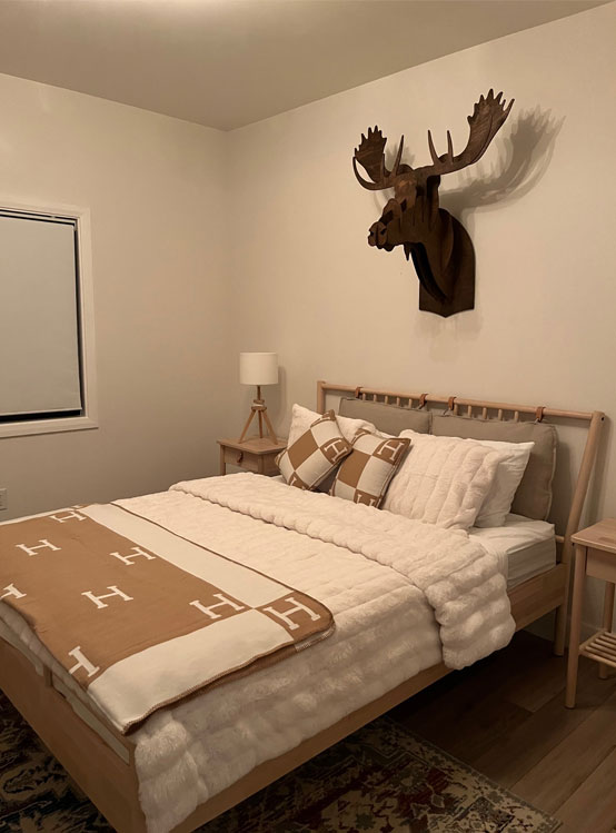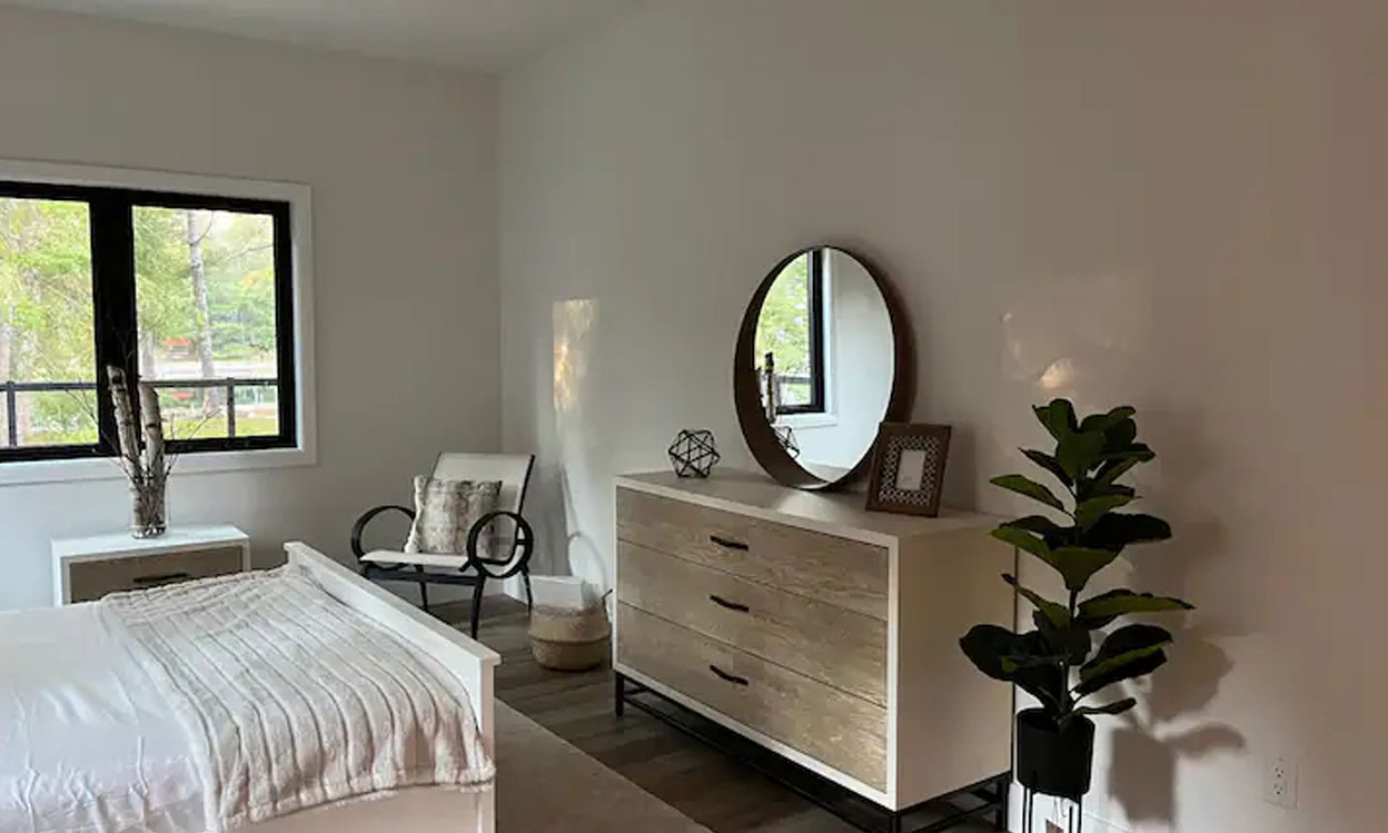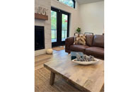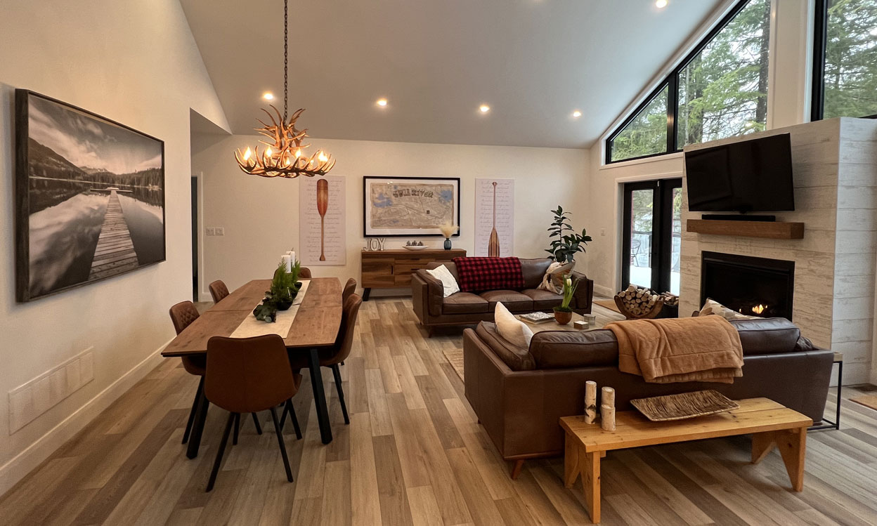 Built in 2022, this modern cottage offers stunning views of the water, and an incredible living room with sky-high glass windows overlooking the river. The living room leads out to a wrap-around deck with Muskoka chairs, new gas BBQ, and a large family dining table, perfectly set for your morning coffee or group dinners. The kitchen comes fully stocked with all serveware as well as high-end Kitchen Aid appliances.