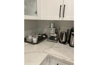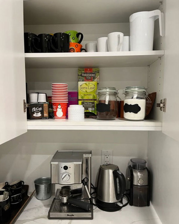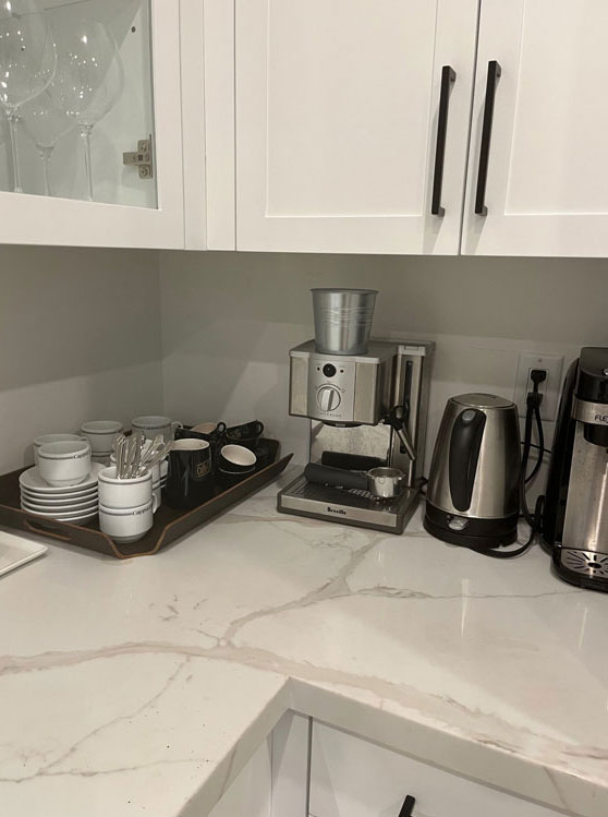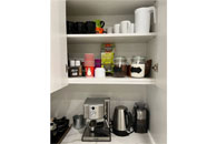 - Nespresso coffee maker (pods not provided), Espresso machine, kettle and serving area.