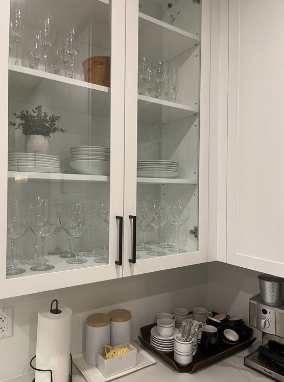 - Cupboards stocked with pots, pans, cutlery, mugs, glasses, serving platers, wine glasses, plates, and bowls.