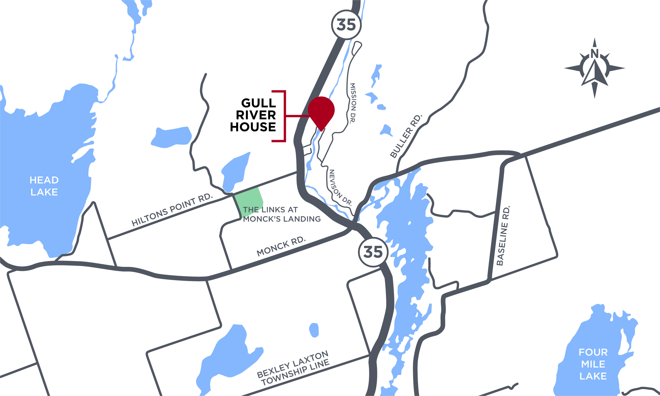 - Minden (35 minutes from the cottage) is due north on HWY 35.